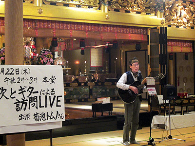 途中で1〜2歳くらいの男の子を抱えた若いお母さんが最前列に座った。すかさず声をかけ、子供向きの歌をお勧めした。