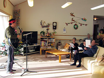 カラオケ大会では職員を含めて60名前後の人が場にいたが、私のライブになるとかなりの方々が帰るか自室に戻ってしまったらしく、40名前後に減っていた。場全体が疲弊した印象で、曲に対する反応もいまひとつだった。