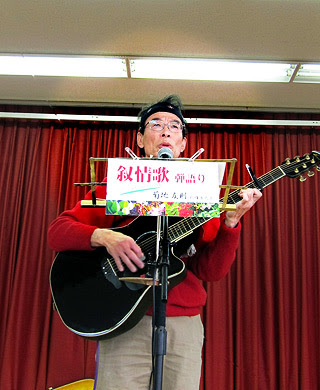 しつこい残暑のなか、16時ちょうどに先方に着いたが、会場では入居者やその家族、元職員などによるカラオケ大会の真っ最中で、大変な盛り上がりよう。4人の審査員による採点方式で、出場者も応援も力が入る。私のライブは16時20分に開始予定だったが、審査員全員の総評、上位3名の表彰式や賞品贈呈式などがあり、進行がかなり遅れた。