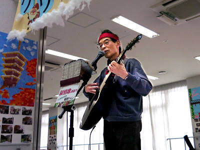 聴き手は入居者や家族、地域住民や職員を加えて50名ほど。全曲をストローク系の調子のいい曲でまとめたので、会場からは手拍子が自然に出る。かっては叙情系の静かな曲調を一部混ぜて歌っていたが、最近の場の傾向から、その路線は捨てた。
