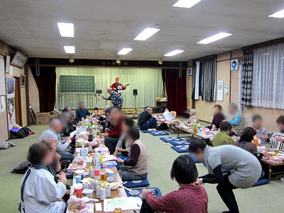 ところが、盆踊りが終わるとホールにいた人々は一斉に隣接するロビーへと消え、ホール内の出店は片づけが始まった。どうも雰囲気がおかしい。ロビーでは最後に残った食べ物系出店が値引きに入り、けっこうな盛り上がりよう。