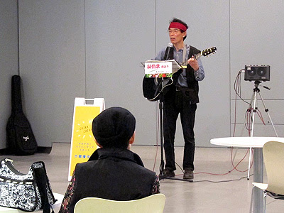会場は人が絶えず流れている印象で、常時いる人数は5〜20人ほど。曲によって波がある。これまでさまざまな場所で路上系、街角系のライブを試みたが、これほど手応えのある場は初めてだった。午後4時近くになり、喉にも限界を感じ始めた。ギターを押さえる左手の握力も下がっている。曲紹介もMCもないので、負担はかなりのものだ。最後の曲で普通のライブのように挨拶をした。