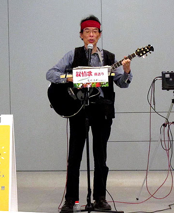 シャンソンのルーツはそもそもお高くとまったものではなく、パリの街角などで吟遊詩人が楽器を手に歌うように語ったものが始まり。その原点に近い形で歌ったのだから、それは似合うはずである。第2ステージではがらり構成を変え、日本の叙情歌を中心に歌ったが、強い手応えを感じたのは、後半に連発した唱歌だった。歌を聴きつけた中高年の女性がどんどん増えてきて、壁や柱にもたれかかり、じっと目をとじて旋律に合わせて身体を揺らせたり、いっしょに口ずさんだりしているのだ。