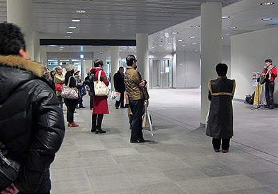 理由ははっきりしないが、おそらく天井高が影響しているのではないだろうか。他の2会場の音の反響があまりによいので、なおさらその違いが目立ってしまう。1〜2曲だけ聴いて立ち去る人が多数いたが、どうやらこの時間帯は長く留まって聴いてくれる人が少ないようだ。最も反応があったのは、中程で歌った「仰げば尊し」。喉がかなり馴染んできて、自分の得意曲ということもある。