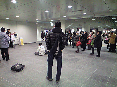 普段よりも早めに事務局に行き、率直に相談すると、「いつも遅く始める方なので、開始すぐには現れないと思いますよ」とのこと。それなら早めに始めて早めに終えてしまうに限ると、手続きを済ませてただちに地下へと向かった。会場は過去に2度歌っている北端の北4条広場。真冬は最も寒い場だが、すでに冬の峠は越えている。到着は14時10分前で、素早く機材をセット。早めの14時5分から歌い始めた。