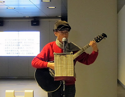 この日は同じギター弾き語りのLOVERSSOULさんとの共演だったが、互いのタイムロスを最小限にするべく、事前にメールで詳細なタイムテーブルを打合せ、パフォーマンス用の案内板運搬担当も決めた。13時50分に会場に入り、14時ちょうどから演奏開始。お店の改装で長めの休暇を貰っている妻がつきあってくれ、最初の数曲だけ会場にいて写真を撮ってくれた。