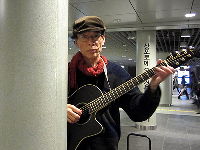 休憩なしで50分くらい歌ってそろそろ撤収どきと考え、それまでのフォーク&ポップス路線をガラリ変更し、演歌の「釜山港へ帰れ」を歌ってみた。2日前のデイサービスライブで受けた春向きの曲である。