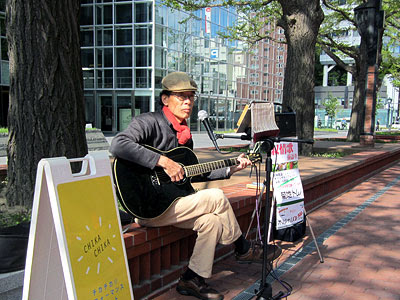 地上でパフォーマンスするにはまだ時期的に早いせいか、広場の割当て枠はあっても、午後のエントリーはゼロ。昨秋にこの広場での実証試験を何度もやった私も躊躇していたが、直前の北4条広場でやったチカチカパフォーマンスが納得できない結果だった。集客や反応がパッとしないのは、もしかして広場そのものとの相性が悪いせいかも…?と思い立ち、ならば広場としては歴史が浅く未知数だが、その分新しい聴き手の反応が期待できるのでは…と、淡い期待を抱いて歌ってみることにした。