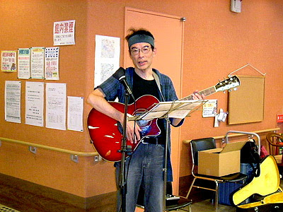 いずれも介護の必要な方で、一人では動けず、会場全体の集中度がかなり緩んだ。そこでしばし歌うのをやめ、歌のコード進行を延々と弾きつつ、場の空気をうかがう。一瞬落ち着いた間隙をねらってMCなしで歌い始めたら、場がすっと落ち着いた。